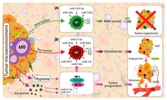 Macrophage polarization in the TME is influenced by local factors towards an M1 proinflammatory, antitumor or towards an M2 protumor, anti-inflammatory state. Cancer and TME cells directly influence the macrophage phenotypic dynamics by modifying the composition of secreted exosomes, which circulate the noncoding RNAs (ncRNAs), microRNAs (miRNAs) and other molecules between cells. (A) The upregulation of miR-130a, miR-1207-5p and miR-125b direct the macrophage polarization towards an M1 phenotype in non-small cell lung cancer (NSCLC), which will express M1 proinflammatory markers such as interleukin (IL)-12, IL-23, TNF-α and interferon gamma (IFN-γ), which further increase the reactive oxygen species (ROS), leading to efficient tumor suppression. The local TME is a hypoxic environment that stimulates the upregulation of hypoxia-inducible factor 1 (HIF-1) genes. Hypoxia-inducible factor 1-alpha (HIF-1α) is upregulated by local hypoxia and by an upregulation of miR-31-5p and downregulation of miR-214. HIF-1α is a known modulator of M2 macrophage polarization. (B) Polarization towards the M2 phenotype is acquired by the direct influence of HIF-1α and various dysregulated miRNAs from the local TME, including the upregulation of miR-103a, miR-21-5p and miR-320a and downregulation of miR-4319, miR-130a and miR-155. M2-polarized macrophages express specific markers, such as IL-4, IL-10, IL-13, TGF-β and PGE2, which further support the pro-neoplastic processes. HIF-1α and M2 macrophages support the tumor progression by enhancing the epithelial-to-mesenchymal transition (EMT), angiogenesis and metastasis.