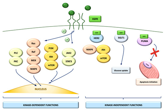 However, besides its tyrosine-kinase dependent activity, EGFR can also mediate cellular processes through the capacity to physically interact with other proteins, such as sodium-glucose cotransporter 1 (SGLT1), and thereby modulate protein subcellular trafficking [14]. EGFR associates with p53-upregulated modulator of apoptosis (PUMA), a proapoptotic member of the Bcl-2 proteins family, and as a consequence of EGFR-PUMA interaction, PUMA is sequestered in the cytoplasm, avoiding it from being translocated onto the mitochondria to initiate apoptosis (Figure 1).