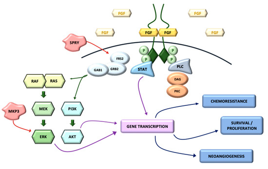 Mainly, two different mechanisms have been described in the further transmission of the signal. The first one is the activation of RAS-dependent mitogen activated protein-kinase (MAPK) and Raf phosphorylation. The second one leads to cell activation through other signaling molecules, such as Shb, Src kinase and STATs (signal transducers and activators of transcription), amongst others. The whole FGF/FGFR pathway is strongly regulated by feedback mechanisms, such us SPRY (which down-regulates the activation of growth factor receptor-bound protein) and MKP3 (which attenuates MAPK signaling) [51] (Figure 2).