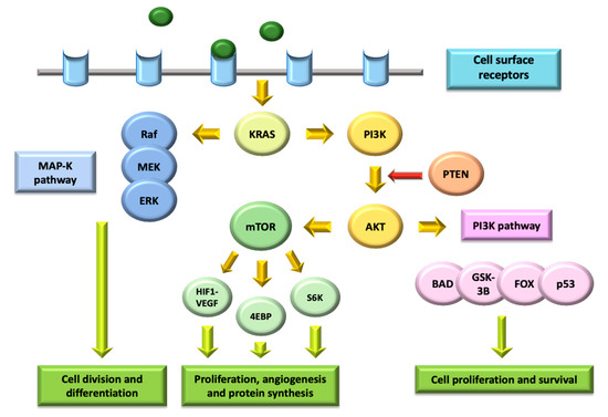 PI3K is a family of lipid kinases with the capacity to phosphorylate inositol phospholipids, further divided into two subclasses: IA (activated by tyrosine-kinase receptors) and IB (activated by receptors coupled with G proteins). PI3K stimulation leads to the recruitment of signaling proteins such as Akt/PKB, and the production of second messengers that regulate several processes involved in cell cycle modulation [82]. The activation of the PI3K pathway is related to the MAP-K pathway (Raf/MEK/ERK), since both of them highly depend on KRAS stimulation.