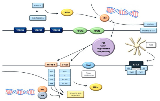 Among these paracrine molecules, the vascular endothelial growth factor (VEGF) has been proved as a master regulator of tumor angiogenesis, promoting increased vascular permeability [101]. The hypoxia-inducible factor 1 (HIF-1) regulates VEGF expression. Oncogenic mutations affecting the RAS pathway and receptor crosstalk with other growth factors can stimulate VEGF expression [102]. The binding between VEGF and its receptor (VEGFR1 and VEGFR2) induces cell proliferation via the MAP-k pathway (RAS/RAF/ERK) and increases vascular permeability through the activation of SRC signaling (Figure 4) [103].