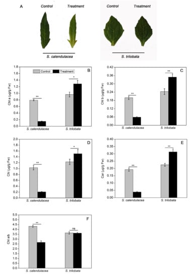 Effect on appearance (A), Chl a (B), Chl b (C), Chl (D), Car (E) content and Chl a/b (F) in two Sphagneticola species under HT treatment (35 ± 1 °C). The data represent the mean ± SE (n = 5). Asterisks above columns indicate statistical significance for comparisons between HT and room temperature. (** p < 0.01 and * p < 0.05).