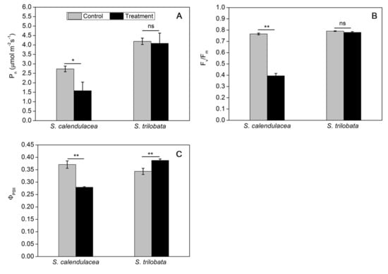 Under HT treatment, we found that there was a significant decrease reduction of 42.2% in net photosynthetic rate (Pn) values of S. calendulacea (p < 0.05). However, no significant differences were observed in the Pn values of S. trilobata (Figure 2A). The photosynthetic efficiency of plants is closely related to the electron transfer of chloroplasts. With respect to the control treatment, we found that S. calendulacea and S. trilobata showed decreases in maximum photochemical efficiency of PSII (Fv/Fm) of 48.5% and 1.4% under HT treatment, respectively (Figure 2B). We also observed that the operational photochemical efficiency (ΦPSII) increased in S. trilobata but was significantly inhibited in S. calendulaceas with a decrease range of 24.6% during the exposure to high temperature (Figure 2C).