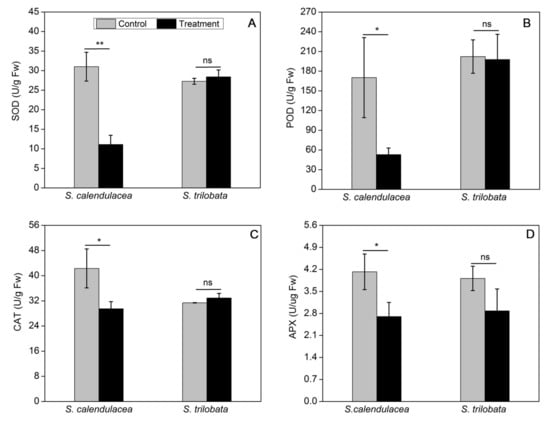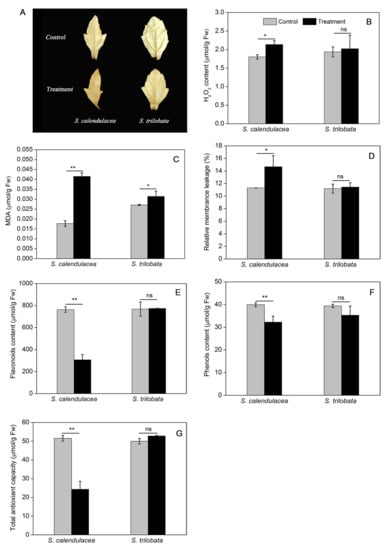 Flavonoids and total phenols are antioxidants that exist in plants to scavenge ROS, and the total antioxidant capacity (TAC) of leaves is the comprehensive performance of the main antioxidant substances in the leaves. The results showed that, compared with the control treatment, no significant differences in the values of flavonoids, total phenols or TAC were observed for S. trilobata under HT treatment. However, S. calendulacea showed decreased flavonoids, total phenols, and TAC values of 59.8%, 19.2%, and 52.8%, respectively (Figure 3E–G).