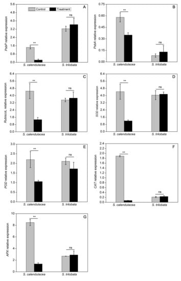 The expression of genes encoding photosynthesis and antioxidant enzymes was measured by the method of qRT-PCR. The results showed that the expression levels of photosynthesis-related genes, including PsbP, PsbA, and Rubisco L, were slightly increased in S. trilobata under HT treatment, but there were no significant differences in all of them. In contrast, the transcript levels of photosynthesis-related genes decreased by 1.6–7-fold in S. calendulacea under HT treatment (Figure 5A–C). The expression pattern of antioxidant enzyme-related genes was similar to that of photosynthesis-related genes. Therefore, SOD, POD, CAT, and APX gene expression levels were also not significantly different in S. trilobata, while these levels were all decreased in S. calendulacea and the expression of CAT was most obviously decreased by approximately 27.0-fold under HT treatment compared to the control treatment (Figure 5D–G). The expression of these key enzyme genes at the transcription level was consistent with a previous report related to photosynthetic capacity (Figure 2A) and antioxidant enzyme activity (Figure 4).