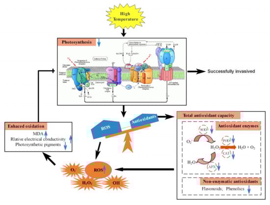 Alien species invasion is recognized as an important part of global environmental change. Throughout the 21st century, climate change and invasive alien species have been threatening biodiversity [,]. In many cases, climate warming may facilitate the spread of invasive plants by increasing their growth and competitive ability []. Sphagneticola trilobata (L.) Pruski (Asteraceae), listed by the IUCN among the top 100 of most alien invasive species in the world, is a perennial creeping herb and native to South America []. It is now widely distributed in many countries and regions of Southeast Asia and the Pacific. In the 1970s, it was introduced into China as a ground cover plant and soon escaped into the wild. At present, it is widely distributed in Southeast China, coastal areas, islands, and other areas []. In South China, S. trilobata has been expanding continuously, showing strong tolerance ability under high temperature in summer, crowding out Sphagneticola calendulacea (L.) Pruski and forming a single dominant species, which seriously threatens the biodiversity of its indigenous congener []. This is closely related to its strong resistance mechanism.