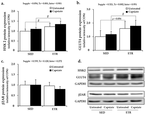 Results of metabolism-associated protein expression in plantaris muscle: (a–c) quantification of HXK2, GLUT4, and β2AR, respectively; (d) the representative Western blot images. Supple, supplement effect; Tr, training effect; Inter, interaction effect; HXK2, hexokinase 2; GLUT4, glucose transporter 4; β2AR, beta-2 adrenoceptor; GAPDH, glyceraldehyde 3-phosphate dehydrogenase; CON, sedentary control group; SED, sedentary groups; ETR, exercise-trained groups. Values represent the mean ± standard deviation (n = 6). # p < 0.05.