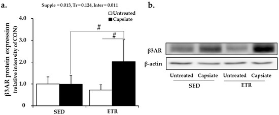 Unlike the results of the skeletal muscles, the protein expression level of beta-3 adrenoceptor (β3AR), the receptor of adrenaline and noradrenaline predominantly distributed in the adipose tissues, was solely elevated by the combination of exercise and capsiate (Figure 6a,b). It indicated that the ability of lipolysis was enhanced. Therefore, it was considered that the additive antiobesity effects of ET with CI resulted from the enhancement of lipolysis ability according to β3AR upregulation in abdominal adipose tissue.