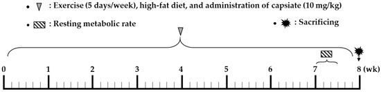Collectively, the results of these previous studies highlight the benefits of ET and CI in preventing obesity. However, only one study investigated the combinatorial effects of exercise and capsiate, but it had its limitations as the total amount of CI and exercise volume were not strictly controlled [25]. Meanwhile, the antiobesity effects of exercise in combination with capsaicin are well documented [26,27], suggesting the probable benefits of combination treatment with exercise and capsiate in ameliorating obesity. Therefore, the aim of this study was to examine whether the antiobesity effects of ET can be further enhanced by CI through a change in resting energy expenditure in diet-induced obese mice as well as its effects on metabolism-associated molecules and key enzymes in the blood, adipose tissue, and skeletal muscles. Despite the fact that skeletal muscles are the most critical determinants of the resting energy metabolism rate [28], no study has examined the effects of ET with CI on metabolism-related molecules in skeletal muscles.