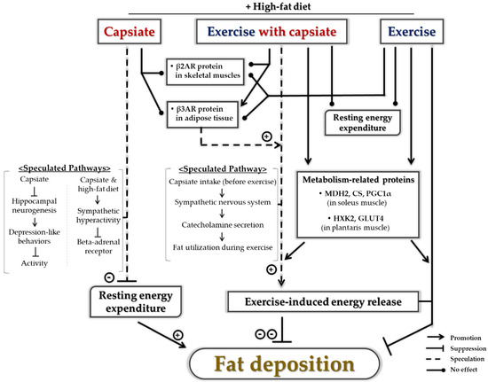 In summary, the purpose of this study was to examine whether the antiobesity effects of ET can be further enhanced by CI via change in resting energy metabolism and to determine its effects on metabolic molecules in diet-induced obese mice. After the 8-week experimental period, ET combined with CI additively reduced abdominal fat rate compared to ET alone, but the resting EE was not affected by CI in the trained group. Thus, we assumed that CI before exercise may enhance FO during exercise and consequently cause loss of fat. However, the chronic intake of capsiate without exercise increased the abdominal fat rate in obesity-induced mice, which may result from the reduced resting EE. Then, we tentatively suggested that the reduced resting EE may be attributed to the following reasons: (1) capsiate might affect activity levels via suppression of hippocampal function and (2) the combination of capsiate and high-fat diet could downregulate βAR via sympathetic hyperactivation. Therefore, we suggest that capsiate could be a candidate supplement for maximizing the antiobesity effects of ET via upregulation of β3AR in adipose tissue. However, capsiate treatment without exercise during high-fat diet may not be beneficial in managing obesity (Figure 8).