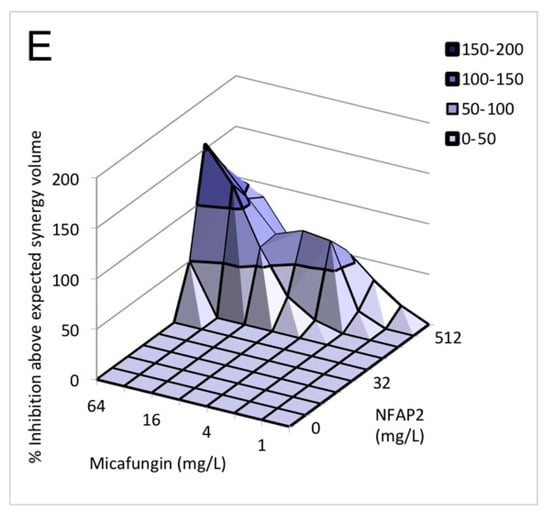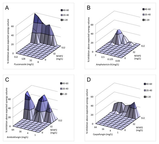 To further evaluate antifungal drugs–NFAP2 interactions, MacSynergy II analysis was used in case of all isolates, employing the Bliss independence algorithm in a Microsoft Excel-based interface to determine synergy. MacSynergy-based analysis was performed as previously described [26,37,41,42]. Briefly, synergy and antagonistic volumes were calculated by adding all of the positive values and all of the negative values for each drug combination, respectively [26,37,41,42]. These volumes were then statistically evaluated using the 95% confidence level and expressed in units of μM2%, which are analogous to the units for area under a dose–response curve in the two-dimensional graph [26,37,41,42]. Synergy or antagonism is significant if the interaction volumes are >25 μM2% or <25 μM2%, respectively (corresponding to log volumes > 2 and log volumes < 2, respectively). Values between 25 μM2% and 50 μM2% (values in log volume between >2 to 5) should be considered as minor synergy. Values between 50 μM2% and 100 μM2% (values in log volume between >5 to 9) indicate moderate synergy or antagonism, while values over 100 μM2% (values in log volume between >9) represent strong synergy [26,37,41,42]. When a small number of drug concentration combinations results in antagonistic interaction in a generally synergistic combination, the applied terminology is ‘synergy for most combinations’. While a small number of drug concentration combinations results in synergistic interaction in a generally antagonistic combination, the applied terminology is ‘antagonism for most combinations’ [41].
