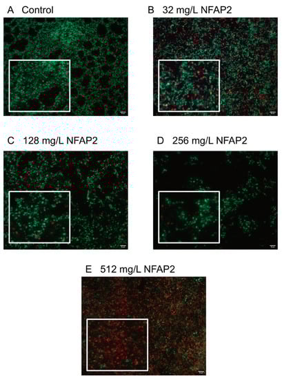LIVE/DEAD fluorescence imaging of one representative C. auris isolate (isolate 10). Image (A) shows the untreated biofilm, while images (B–E) present the NFAP-exposed biofilms at 32 mg/L, 128 mg/L, 256 mg/L and 512 mg/L NFAP2 concentrations, respectively. Live cells (green) and nonviable cells (red) were stained with Syto9 and propidium iodide, respectively. All images show typical fields of view. Scale bars represent 10 μm.