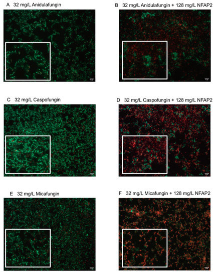 The LIVE/DEAD viability assay focused primarily on the echinocandins because this antifungal group is considered in alternative anti-biofilm therapeutic strategies, such as antifungal lock therapy [11]. For the NFAP2 concentrations tested (Figure 2A–E), an extensive anti-biofilm effect was only observed after exposure to 512 mg/L NFAP2 (Figure 2E), when compared to untreated one-day old biofilms (Figure 2A). The NFAP2 treatment alone showed a concentration-dependent activity, where the ratio of dead cells was 9%, 43%, 67% and 90% after 32 mg/L, 128 mg/L, 256 mg/L and 512 mg/L NFAP2 exposure, respectively (Figure 2A–E). It is noteworthy that the 128 mg/L NFAP2 (Figure 2C) and 32 mg/L echinocandin treatments alone did not produce remarkable cell death. The ratio of dead cells was 28%, 16% and 24% in the samples following the 32 mg/L anidulafungin, caspofungin and micafungin treatments, respectively (Figure 3A,C,E). However, their combined application with 128 mg/L NFAP2 resulted in a significant total cell number reduction. The cell number decreased with 44%, 34% and 41% after co-application of 128 mg/L NFAP2 with 32 mg/L anidulafungin, caspofungin and micafungin, respectively (Figure 3B,D,F). In addition, the percentage of dead cells was 74%, 72% and 60% in these samples, respectively (Figure 3B,D,F). This observation further strengthened the results of the previous XTT assay, and clearly demonstrates that co-administration of NFAP2 with echinocandins on potentially echinocandin-resistant biofilm rendered them susceptible to these antifungal agents.