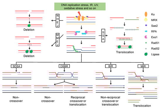 Overall, DNA repair deficiency would dramatically increase the frequency of chromosomal rearrangements. It should be noted that the overactivity of certain HR components also brings risks to genome. For example, the 3′ to 5′ exonuclease activity of Mre11 contributes to large deletions and translocations due to the excessive process of DSBs [], emphasizing that strict regulation of the DNA repair activity is pivotal to genome stability.