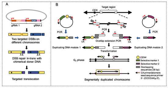 Fleiss et al. [] reported an application of the Clustered Regularly Interspaced Short Palindromic Repeats-CRISPR associated (CRISPR-Cas ) system to generate uniquely targeted translocation. In their protocol, two Cas9-induced DSBs were introduced on different chromosomes to force the trans-chromosomal repair through HR by chimerical donor DNAs (Figure 2A) []. The authors also developed a protocol to generate multiple concomitant reciprocal translocations by introducing guide RNA sequences targeted to LTRs []. It was demonstrated that LTR-mediated rearrangements are efficient to fuel phenotypic diversification []. The work of Natesuntorn et al. [] described a PCR-mediated method to construct targeted chromosomal segments (Figure 2B). As shown in Figure 2B, two guiding “duplicating DNA modules” were first amplified by PCR and transformed into yeast cells to initiate the segmental duplication of the targeted chromosomal region by HR. Up to 300 kb of the targeted chromosomal region can be generated efficiently by this method []. Phenotypic assays of the segmental duplication mutants showed direct associations between segmental duplication and improved resistance against environmental stressors (see Section 5). However, since the duplicated region in this study was large (100 to 300 kb) and always contained at least dozens of genes, further work is required to verify the contribution of a specific gene or a smaller number of genes to the improved tolerance.