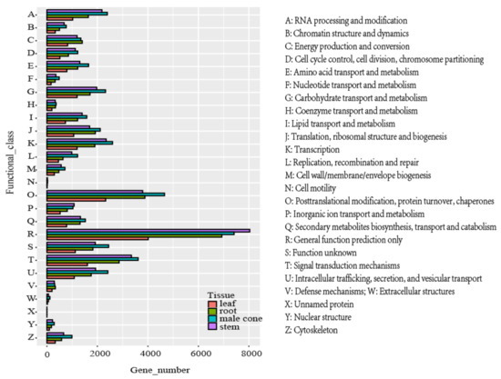 In the KOG classification, 1519 (male cone), 778 (leaf), 1310 (root) and 1326 (stem) genes were annotated as the “biosynthetic transport and catabolism” (Q). And 305 (male cone), 200 (leaf), 332 (root) and 294 (stem) unigenes were assigned to the “defense mechanism” (V). Secondary metabolites were non-nutritive substances in plants, so they were once considered as wastes during plant metabolism. However, after in-depth research on it, researchers found that secondary metabolites play an important role in plant growth and development and in responding to various biotic and abiotic stresses [22,23]. It is the long-term evolution of plants in the process of adapting to the living environment.