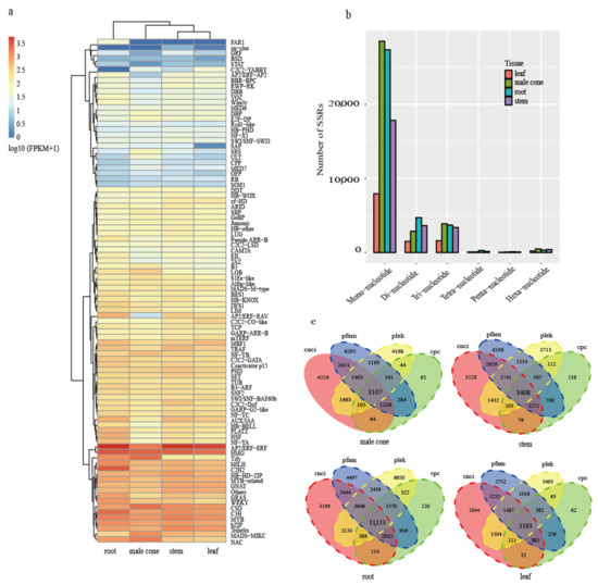 Identification of the transcription factors (TFs), simple sequence repeats (SSRs) andlong non-coding RNAs (lncRNAs). (a) Expression profiles of transcription factor families in four tissues; (b) the histogram representing the number of different types of SSRs; (c) Venn diagram of lncRNAs predicted by four different methods.