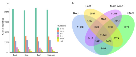 To investigate the expression patterns of unigenes in C. oliveri, the Illumina clean reads were mapped to the SMRT non-redundant transcripts to determine expression level using fragments per kilobase of transcript sequence per million base pairs sequenced (FPKM). The mapped reads of each tissue were 48,227,272 (90.18%, male cone), 43,922,320 (90.31%, leaf), 33,697,206 (64.08%, root) and 44,716,176 (89.30%, stem), respectively (Table S6). In the four tissues, the number of unigenes in different expression intervals was almost the same. The four tissues had 2656 (1.37%, root), 2436 (1.26%, stem), 2503 (1.29%, leaf) and 2397 (1.24%, male cone) unigenes with high expression, and their expression levels were greater than 60 FPKM (Figure 3a). Using FPKM > 0.3 as the standard for unigenes expression, a Venn diagram of unigene expression in four tissues was drawn and a total of 41,123 unigenes expressed in all tissues were found (Figure 3b). In addition, the number of genes uniquely expressed in each tissue was 11,650 (root), 3587 (leaf), 11,348 (male cone) and 5671 (stem).