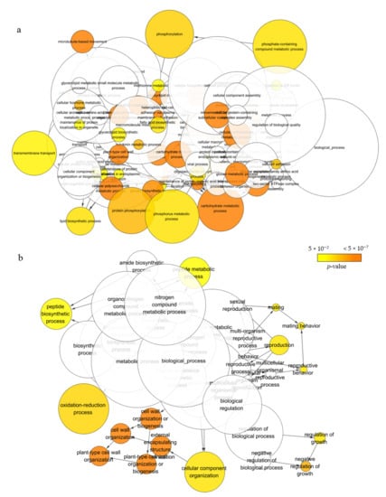 The “biological process” category of Gene Ontology (GO) enrichment analysis of tissue-specific expressed genes. (a) male cone; (b) root.