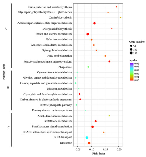 The Kyoto Encyclopedia of Genes and Genomes (KEGG) pathway enrichment analysis of tissue-specific expressed genes (A): male cone; (B): leaf; (C): root.