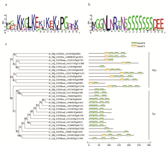 Conserved motif and neighbor-joining (NJ) phylogenetic tree of dehydrins. (a) K motif; (b) S motif; (c) NJ tree.