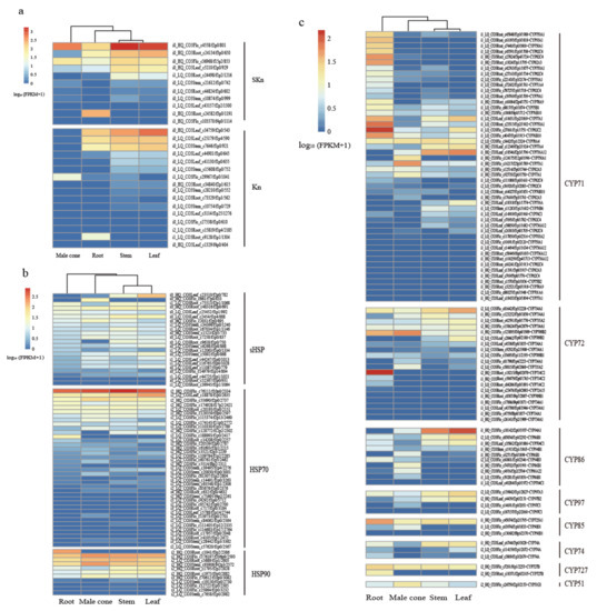 Expression profiles of different genes families in four tissues. (a) dehydrin (DHN) genes families; (b) heat shock protein (HSP) genes families; (c) cytochrome P450 (CYP450) genes families.