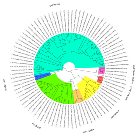A total of 493 complete sequences annotated as cytochrome CYP were found in the four tissues of C. oliveri, of which 195 transcripts were >500 aa (Table S11). 195 cytochrome CYP enzyme sequences were clustered with 95% similarity to eliminate redundancy, and were divided into 118 clusters. The representative sequences in 118 clusters were used as input, and local blastp alignment was performed with 12,112 cytochrome CYP enzyme sequences in the Nelson database to further confirm the sequence annotation results. Sequences with a homology of less than 40% were deleted, and 91 sequences remained, and MEGA-X was used to construct an NJ tree. The results show that different cytochrome CYP enzyme families are grouped together (Figure 8). All sequences of the four tissues can be divided into 8 clans: CYP71, CYP72, CYP86, CYP97, CYP85, CYP51, CYP74 and CYP727.
