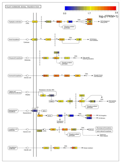 A total of 1299 unigenes from the four tissues were assigned to the Plant hormone signal transduction (ko04075) pathway (Table S12, Figure 9). This pathway mainly involves 40 different substances, which were mainly involved in the signal transduction of cytokinin, gibberellin, abscisic acid, ethylene, brassinosteroids, jasmonic acid and salicylic acid.