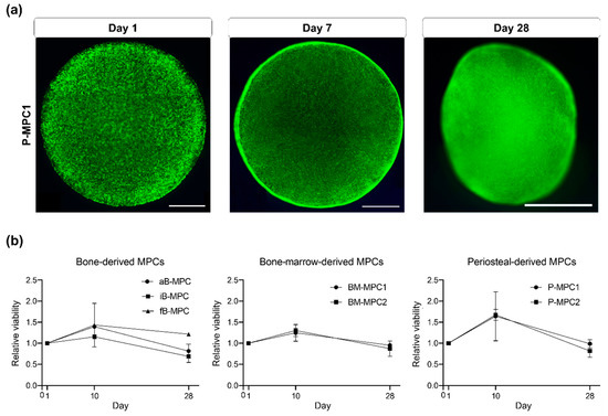 Viability of cells in bioprints. (a) Fluorescence microscopy images of propidium iodide/fluorescein diacetate stained constructs showing living cells in green and dead cells in red on days 1, 7, and 28. Representative images shown for P-MPC1. Scale bar = 1000 µm. (b) Results of alamarBlueTM assay on days 1, 10, and 28 of cultivation. Viability was normalized to the respective value for each cell type on day 1. n = 2.