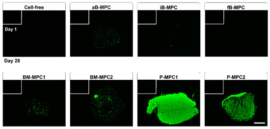 Subsequently, bioprinted constructs were cultivated in osteogenic medium for 28 days. Microscopic images on day 0 showed homogenous distribution in cell-laden constructs (Figure 2). While cell-free bioprints retained their size and discoid shape over the entire cultivation period, shrinkage and central retractions were observed in cell-laden constructs. During cultivation, the P-MPC-laden constructs became progressively less translucent, while the other bioprints retained uniform translucency.