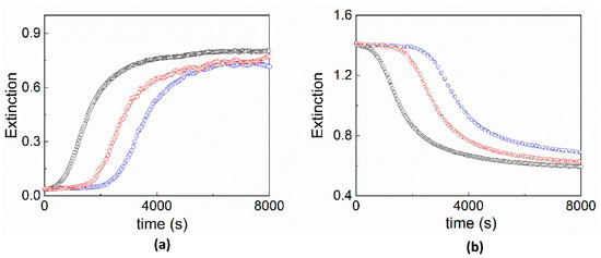 Extinction kinetic profiles recorded at 492 nm (a) and 434 nm (b) for the aggregation of H2TPPS44− induced by adopting three different reagent mixing order protocols (black traces—mix 1; red traces—mix 2; blue traces—mix 3). Experimental conditions: [H2TPPS44−] = 3 μM; [HCl] = 0.3 M; [NaCl] = 0.2 M, T = 298 K. The solid lines show the best fit of the experimental data to Equation (1).