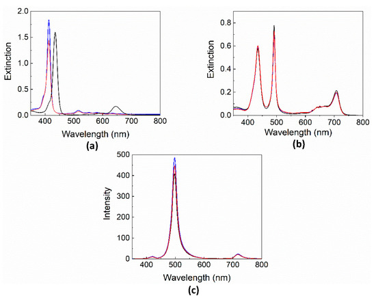 Extinction spectra for the initial species (a) and for the samples at the end of the aggregation (b) together with their corresponding resonance light scattering (RLS) (c) profiles by adopting three different reagent mixing order protocols (black traces—mix 1; red traces—mix 2; blue traces—mix 3). Experimental conditions: [H2TPPS44−] = 3 μM; [HCl] = 0.3 M; [NaCl] = 0.2 M, T = 298 K.
