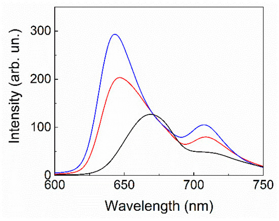 Fluorescence emission spectra comparison among the initial H2TPPS44− (blue trace), after the addition of NaCl (red trace) and the H4TPPS42− (black trace). Experimental conditions: [H2TPPS44−] = 3 μM; [HCl] = 0.3 M; [NaCl] = 0.2 M; λex = 420, T = 298 K.