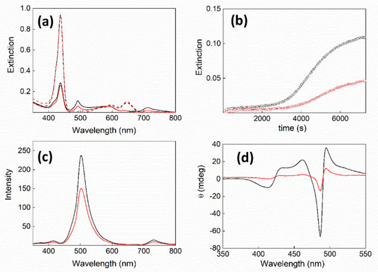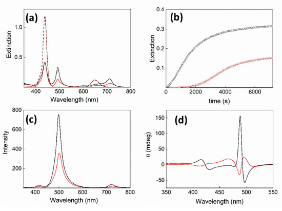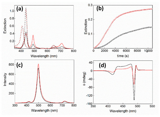 (a) Extinction spectra soon after initial mixing (dashed lines) and at the end of the aggregation (solid lines), (b) kinetic extinction time traces at λ = 492 nm (solid lines show the best fit of the experimental data according to Equation (1)), (c) RLS, and (d) CD spectra for the supramolecular assembling of H2TPPS44− induced by salt and tartrate buffer (L: black lines; D: red lines) using mix 3 protocol. Experimental conditions: [H2TPPS44−] = 3 μM; [NaCl] = 1.5 M; tartrate buffer 100 mM, pH 2.7, T = 298 K.