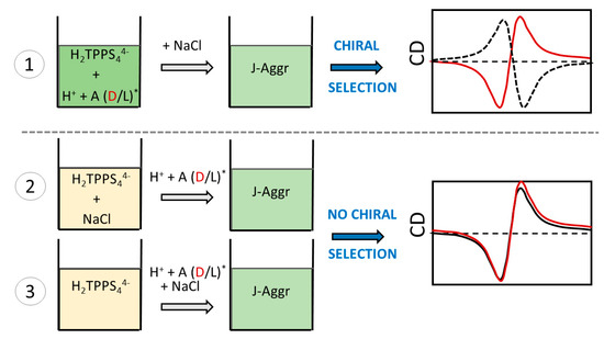 Mixing protocols adopted for the J-aggregation of the H2TPPS44− porphyrin (see text) with the role of D- and L- enantiomers of tartrate anion in the chiral selection.