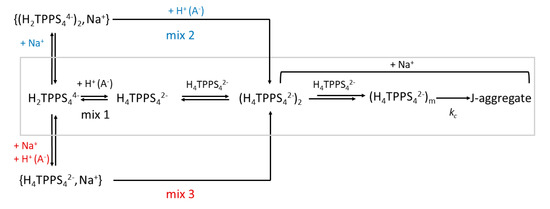 On the basis of the experimental findings, a general mechanistic scheme can be proposed (Scheme 2). In mix 1, after the initial fast protonation of H2TPPS44− to the diacid porphyrin H4TPPS42−, the interaction between this monomeric species leads to a dimer (H4TPPS42−)2 that is stabilized by electrostatic and solvophobic interactions. This species forms quite rapidly, even if in low concentration, and the subsequent uptake of other porphyrins originates the initial nucleus containing m units in the rate determining step of the entire process. From this event, the J-aggregates build up, following an exponential growth (via kc) consuming the monomeric units. The delayed addition of Na+ plays a role in the stabilization of the oligomeric species and the final J-aggregates. In mix 2 the addition of salt to H2TPPS44− promotes the quite slow formation of the H-type dimer with ion pairing of Na+, {(H2TPPS44−)2, Na+}. This species is rapidly converted into (H4TPPS42−)2 that leads to J-aggregates through the previously described path. When Na+ and the acid are simultaneously added to H2TPPS44−, the formation of the H-dimer is largely suppressed and an ion pair between the diacid porphyrin and sodium cations {H4TPPS42−, Na+} forms, which slowly interconverts into the dimer (H4TPPS42−)2. Even if we have no spectroscopic evidence for this species, the much larger lag-time for the relative kinetic profiles (Figure 1, blue traces) suggests the slower extrusion or rearrangement of the sodium cations to allow for the interaction between the porphyrin units.