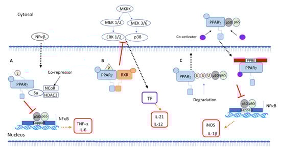 Many studies show the participation of another nuclear transcription factor, the PPARγ, in inflammatory processes. This factor can negatively modulate other transcription factors in transrepression mechanisms [].