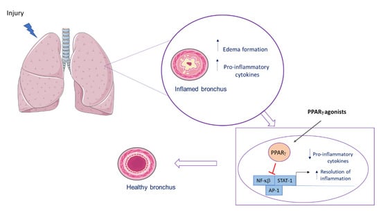 PPARγ also regulate several metabolic diseases, such as obesity [], diabetes [], inflammatory diseases [,,,] and neuroinflammatory disease []. In this review, we focus on PPARγ, highlighting its attributions in pathophysiological processes, mainly those involving lung injury.