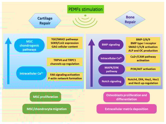 Varani, K.; Vincenzi, F.; Pasquini, S.; Blo, I.; Salati, S.; Cadossi, M.; De Mattei, M. Pulsed Electromagnetic Field Stimulation in Osteogenesis and Chondrogenesis: Signaling Pathways and Therapeutic Implications. Int. J. Mol. Sci. 2021, 22, 809. https://doi.org/10.3390/ijms22020809