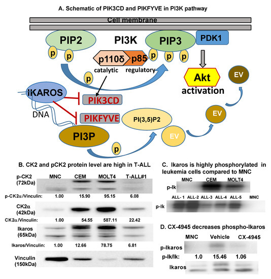 CK2 is overexpressed in T-ALL compared to normal mononuclear cells. (A) Schematic showing PIK3CD and PIKFYVE genes in the PI3K pathway. (B) Baseline protein levels of CK2α, pCK2, and IKAROS in the T cell leukemia cell panel (CCRF-CEM, MOLT4, and primary T-ALL cells (labeled T-ALL#1)) were measured by Western blot and compared to peripheral blood mononuclear cells (MNCs). The protein level is graphed relative to vinculin as a loading control. (C) Radio-immunoblot showing phospho-IKAROS in a leukemia cell panel (CCRF-CEM, MOLT4, and primary T-ALL cells (labeled ALL#1-5)) compared to MNCs. (D) Radio-immunoblot showing a decrease in the phospho-IKAROS level following CX-4945 treatment. MOLT4 cells were treated with 10 μM of CX-4945 for 24 h. EV, endosomal vesicle; PIK3CD, phosphatidylinositol 4,5-bisphosphate 3-kinase catalytic subunit delta; and PIKFYVE, phosphoinositide kinase, FYVE-type zinc finger containing; PI3K, phosphoinositide 3-kinase; P, phospho; PIP2, phosphatidylinositol 4,5-bisphosphate; PIP3, phosphatidylinositol 3,4,5-trisphosphate; PDK1, phosphoinositide-dependent kinase; PI3P, phosphatidylinositol-3-phosphate; PI(3,5)P2, phosphotydile inositol 3,5-biphosphate.