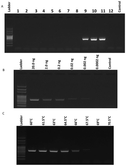 Optimization of the developed marker. (A) Non-target amplification of FNR3-F/FNR3-R. Sample numbers correspond accordingly: 1. Phytophthora capsici, 2. Phytophthora sojae, 3. Pseudoperonospora cubensis, 4. Cucurbit leaf crumple virus, 5. Rhizoctonia solani, 6. Colletotrichum orbiculare, 7. Fusarium solani, 8. F. oxysporum f. sp. vasinfectum, 9. F. oxysporum f. sp. lycopersici, 10. Fusarium oxysporum f. sp. niveum (FON) race 1, 11. FON race 2, 12. FON race 3, and control = negative. (B) Sensitivity determination of FNR3-F/FNR3-R using a serial dilution of FON DNA. DNA concentrations ranged from 20 ng/µL to 0.2 pg/µL. PCR positive bands amplified samples as low as 2.0 pg/µL. (C) Gradient PCR results to optimize annealing temperature. Temperatures ranged from 60 to 70.5 °C. The optimized temperature was 63 °C.