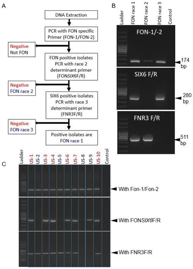 (A) Flowchart of Fusarium oxysporum f. sp. niveum (FON) isolate testing with all three marker sets to differentiate races 1, 2, and 3. Possible results are highlighted in blue. (B) Example of a practical application on known isolates. (C) Application on unknown field isolates. Absence of amplification of both FONSIX6F/R and FNR3-F/FNR3-R showed a positive identity for races 2 and 3.