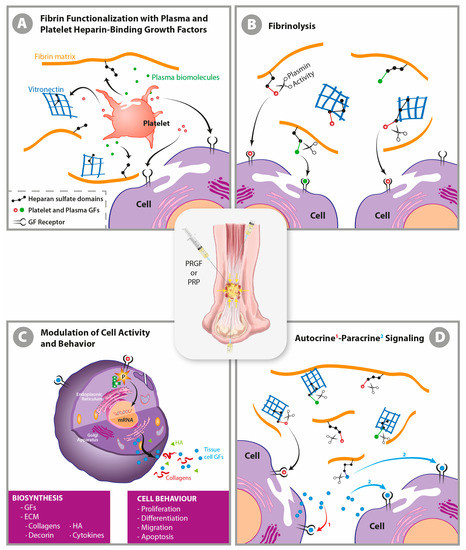 An autologous liquid-to-gel dynamic scaffold as a carrier of biological mediators in tissue repair. When liquid plasma rich in growth factors (GFs) is applied directly into tissue, the newly formed three-dimensional matrix clot traps many of the released growth factors and cytokines from platelet degranulation and from plasma by binding them to the heparin sulfate proteoglycan domains of fibrin matrix components in a non-diffusible mode (yuxtacrine or matricrine) (A). However, some GFs in a diffusion mode (autocrine and paracrine) will directly reach their cognate cell-surface receptor (D), thereby inducing an immediate cell-biosynthetic and cell-behavior modification (C). The ensuing progressive biodegradation of a fibrin clot is mediated by the serine protease plasmin, which is yielded through both the activation of plasminogen by a tissue plasminogen activator [24] and the immune and mesenchymal cells that migrate into the clot, thereby matching the speed of the ingrowing repair tissue [17,21,22,25,26] (B). GFs act as extracellular ligands by binding to transmembrane receptors arrayed on the surface of target cells, thereby activating intracellular signal transduction pathways that convey the signal to the nucleus to eventually induce a wide range of cell specifications during inflammation and the repair process including cell survival, proliferation, migration, differentiation, and maturation and changes in protein synthesis and metabolism (C). These effects include the synthesis and secretion of GFs and cytokines, which interact with their receptors in a diffusible manner (autocrine and paracrine pathways); the synthesis of extracellular matrix (ECM) components such as collagens, decorin, hyaluronic acid, and glycosaminoglycans; and cell survival, proliferation, differentiation, and migration (C) [17]. Only by understanding the unbreakable link between GFs and fibrin matrix will we grasp the in situ biological function of PRP and the additional pivotal fact that it is not necessary to combine this product with other delivery systems to slowdown the release of GFs.