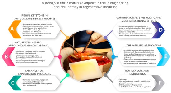 In the context of tissue development, regeneration, and repair processes, GFs behave in a combinatorial, synergistic, and multi-directional manner [41], which has inspired regenerative human-engineered approaches [21,22,41]. Accordingly, many successful strategies for therapeutic tissue regeneration and repair integrate a combination of several recombinant GFs that are frequently embedded in a fibrin scaffold [21,27], although in higher doses than the equivalent native growth factors present within autologous fibrin scaffolds [17]. Moreover, GFs within PRP fibrin matrices circumvent some of the drawbacks imposed by recombinant GFs, including their short half-life and bioavailability, high systemic toxicity, bolus effect, rapid cellular internalization rate, the limited spatial and time scales within which they operate, and the requirement of high therapeutic doses [22,28].