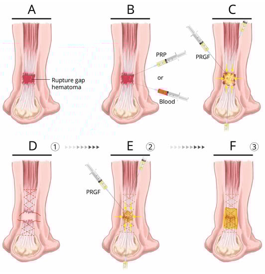 Achilles tendon rupture treatment: conservative and surgical treatment assisted by autologous blood or blood-derived products (PRP). (A) Achilles tendon rupture, rupture gap, and hematoma. (B) Conservative treatment: a single injection of either PRP or autologous blood injected into the gap hematoma. (C) Conservative treatment proposal (in patients with a low functional demand, or for whom surgery is contraindicated). Ultrasound-guided injection of 4 mL of liquid plasma rich in growth factors (PRGF) in close proximity to the apparently healthy tendon tissue at each stump of the tendon and 4–6 mL of liquid PRGF into the gap hematoma; a procedure to be repeated over 2 or 3 consecutive weeks (D–F) Surgical treatment proposal: after the suture is performed with a non-reabsorbable suture material that has been bathed in liquid PRGF (D), 4–6 mL of liquid PRGF is injected in close proximity to the apparently healthy tendon tissue at each stump, as well as into the sutured area (E) within the time window of 10 to 15 min following PRGF activation with CaCl2. This window encompasses the time when the fibrin scaffold is still macroscopically liquid is but undergoing microscopic jellification. Liquid PRGF can extensively permeate through areas that surround the injection site and anchor to the collagen and other ECM proteins exposed in damaged tissue margins through the activated platelets conveyed by the fibrin clot, as a 3D fibrin–extracellular matrix-like malleable structure [17], thereby bridging the gap of injured areas. The time window of 1–5 min is the result of the gel point or clotting time, meaning the change from liquid to solid undergone by the matrix when 15–20% of the fibrinogen has been incorporated into the gel by branching points (approximately 4 min 50 s) [46]. After closing the paratenon and prior to closing the overlying skin, the peritendinous regions are also infiltrated with PRGF; finally, the entire affected area of the tendon is covered with a fibrin membrane of PRGF (F). As general recommendation, we suggest the use of 10 mL Luer lock-type syringes with 21G needles, since the use of small syringes means that large pressures are exerted on the ECM of the tissue during infiltration, thereby accounting for the focalized disruption of the ECM components (a desirable effect in some treatment protocols aimed at disrupting the neovascularization and neoinnervation present in some chronic tendinopathies) [7,42]. Upon infiltration, the needle should be oriented as closely as possible parallel to, and longitudinal with, the tendon fascicles for an optimal diffusion of PRGF [42].