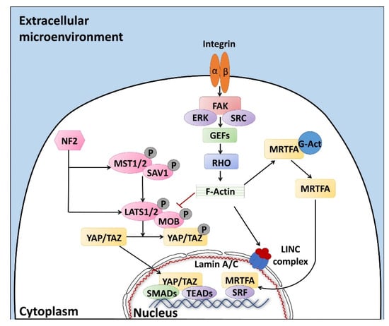 Altogether, the properties described above are defined with the term “mechano-transduction”, which indicates the cellular mechanisms by which mechanical inputs, such as stretching, tension or fluid flow, are converted into intracellular signals [15]. They are regulated by several membrane proteins that modify their folding in response to extracellular biomechanical stimuli [16]. Integrins have been recognized as the main molecular link between cells and the extracellular matrix (ECM). This protein family is characterized by the ability to sense, respond to, and bidirectionally interact with the cellular environment [17]. More in detail, integrin’s key function is to trigger the cytoplasmatic recruitment and activation of adaptors and signaling proteins, such as Protein Tyrosine Kinase 2 (PTK2B, also known as FAK), SRC Proto-Oncogene Non-Receptor Tyrosine Kinase (SRC), and Mitogen-Activated Protein Kinase 1 (MAPK1, known as ERK), which assemble into the focal adhesion complex [18]. Force-mediated formation and/or reorganization of focal adhesion complexes, in turn, modify the Rho family small GTPase activities, leading to enhanced actin polymerization and the formation of stress fibers. This latter event can produce two different effects, described as short- or long-range transmission of force. The first directly affects the nuclear localization and function of the mechanosensitive transcription regulators, such as Myocardin Related Transcription Factor A (MRTFA, also known as MKL1) and YAP/TAZ [19]. The long-range effect transmits the force from the surrounding environment into the cell nucleus, thanks to a physical actin-mediated connection between the ECM and the linker of the nucleoskeleton and cytoskeleton (LINC) complex (Figure 1) [20]. This results in several changes, including chromatin remodeling, exposure of specific sites to transcription factors, gene expression changes, and the modifications of nuclear pore conformation and size, finally promoting YAP/TAZ nuclear translocation.