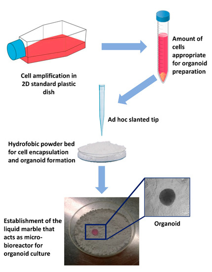 Schematic representation of the protocol used to produce micro-bioreactors and obtain spheroid organoids. 2D cultured cells are detached for the dish and centrifuged. Droplets of medium containing cells are dispensed onto the hydrophobic powder bed. The powder covers the drop, leading to the creation of the liquid marble that allows cell aggregation and organoid formation.