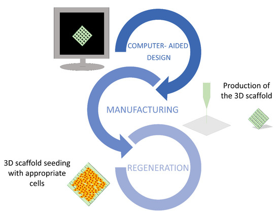 The main fundamental steps needed to construct an artificial organ in vitro. The 3D scaffold shape is modeled using computer-aided design (CAD) software (design). The support is 3D printed after an accurate selection of the most adequate method (manufacturing). Lastly, it is repopulated with the specific cell type/types (regeneration).