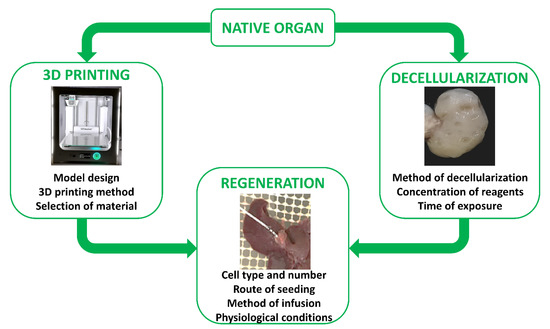 In contrast, the liver represents a simpler, more feasible model, thanks to its regular structure and clear cellular organization. The current technical approaches in liver tissue engineering are based on the use of different methods, such as cell encapsulation, 3D printing, 3D bioprinting, and decellularized organs, which display the appropriate topography and biomechanical properties that facilitate hepatocyte colonization, migration, differentiation, proliferation, and cell polarity [199,200,201]. It is, however, important to highlight that, to date, 3D liver tissue organization and function has been mostly demonstrated in animal models and further studies and evidence are necessary in order to confirm the generation of a functional liver for human transplantation.
