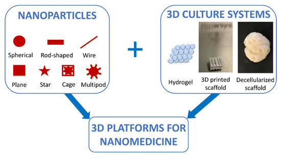 The evaluation of NP delivery is currently being carried out in 3D culture systems because of the 2D culture approach’s failure to account for the extracellular microenvironment that is present in vivo [235]. This also allows for studying how the interactions with ECM components can affect fate and stability of the NPs. In addition, this approach makes it possible to understand how the mechanical forces, such as tension, compression, and interstitial fluid flow, can alter the bioavailability of the delivery vehicle, by redirecting the NPs in the direction of flow and potentially away from the target sites. Furthermore, it is important to remember that cell culture conditions also affect the cell phenotype and thereby influence the cellular response to the delivered drugs. In particular, multicellular drug resistance, possibly caused by the occurrence of hypoxic tissue regions, is able to alter cell proliferation, and poor availability of delivered drugs in deeper tissue layers [236] can be only mimicked in 3D culture conditions. For these reasons, researchers are combining the use of 3D culture systems with nanomedicine, with the final goal to design better predictive in vitro models (Figure 5). Reproducible in vitro 3D tissue culture systems that more closely mimic in vivo tissues, in terms of functionality, morphological, and mechanical architecture, could be applied during the development and evaluation of delivery vehicles, to offer a more predictive platform for assessing in vivo delivery efficiencies. Such systems can serve to bridge the considerable gap between traditional 2D monolayer experiments, animal studies, and clinical trials, since NP formulations can be more effectively optimized in 3D in vitro models.